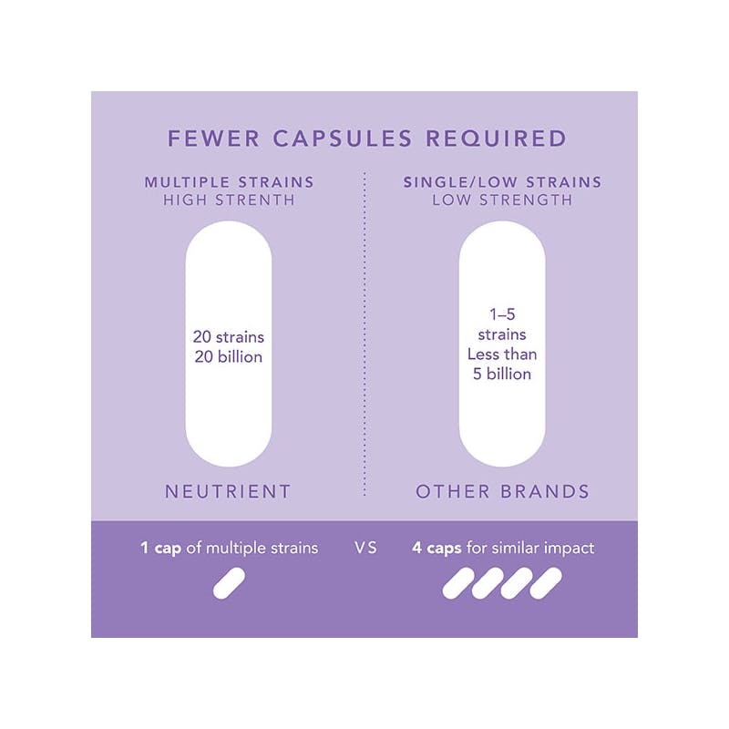 Supplementing with a formula containing 20 microbial strains at a high dose of 20 billion cfu per capsule offers more variety and opportunity for replenishing a naturally diverse gut flora. Single strain, low dose probiotics may be more limited in terms of being able to repopulate a diverse gut microbiome.