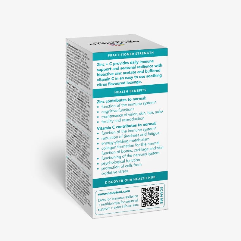 Neutrient Zinc + C proporciona apoyo inmunológico diario y resistencia estacional con acetato de zinc bioactivo altamente eficaz y vitamina C tamponada en una pastilla cítrica calmante.